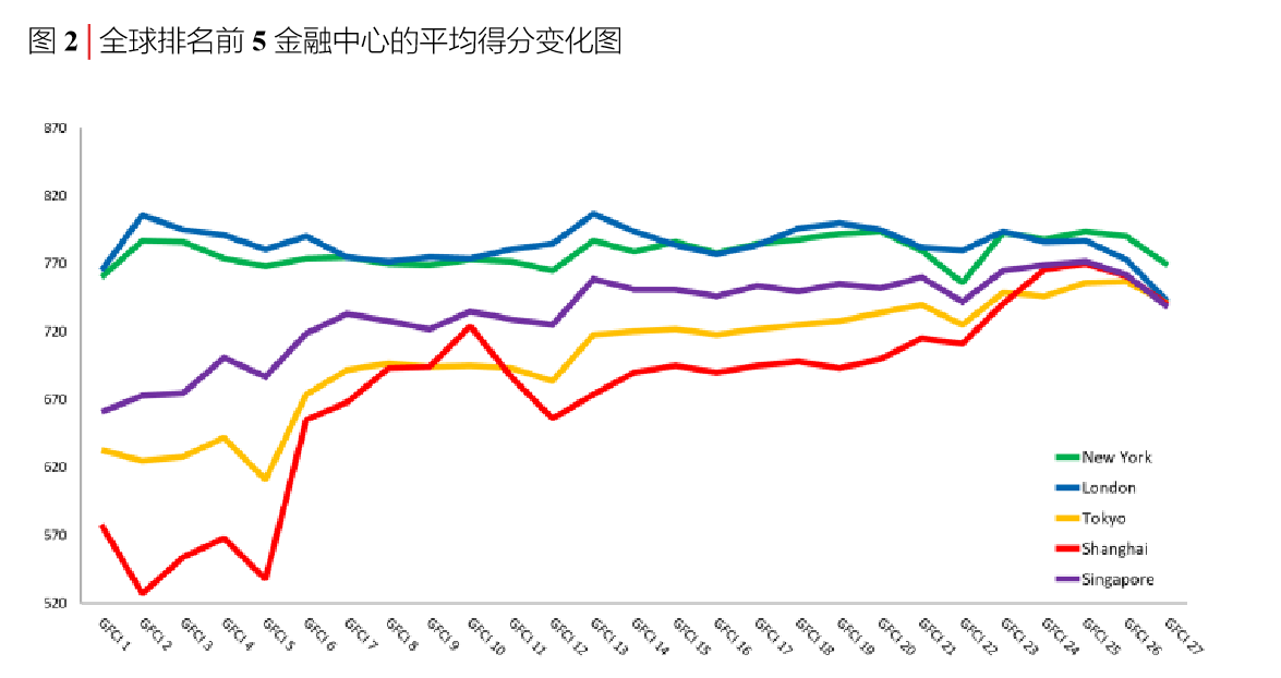 全球金融中心指数(GFCI)是一项由英国Z/Yen集团发起的,从营商环境、人力资源、基础设施、金融业发展水平和声誉五个方面为全球主要金融中心进行分类、评分和排名的评价体系。第27期GFCI采用客观的特征指标和主观的问卷调查相结合的方法,对全球108个金融中心进行评价。其中,特征指标包含了138项具体指标,问卷调查共收到5064位受访者的37695份评价。