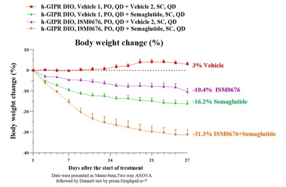 减重高达31.3%!英矽智能提名AI赋能的GIPR拮抗剂ISM0676为临床前候选化合物,与司美格鲁肽联用展现强劲协同减重效果