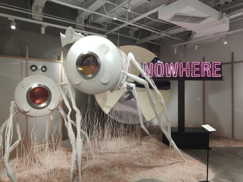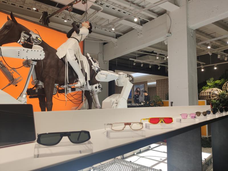 记者在该店现场看到,1楼和2楼共计800平方米的营业面积,大比例布置了颇具未来感的装置艺术,讲述着地球与月球、太阳间因自转和公转角度出现差异后的故事——地球“一年出现了13个月”。随之,一匹马发生了特征变化;人类住在飞船状可移动建筑内,以特殊容器储存氧气,并在外星球无人之境放置环境探测器;一种用于寻找安全无污染新居住地的探险船被广泛使用……想象十分大胆,内容与眼镜完全“不搭”,却成为吸引顾客入店的流量担当。