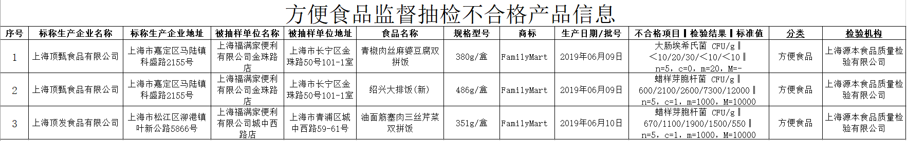 - 上海顶甄食品有限公司生产、上海福满家便利有限公司金珠路店销售的“绍兴大排饭(新)”(486克/盒,生产日期:2019年6月9日),蜡样芽孢杆菌指标不合格;