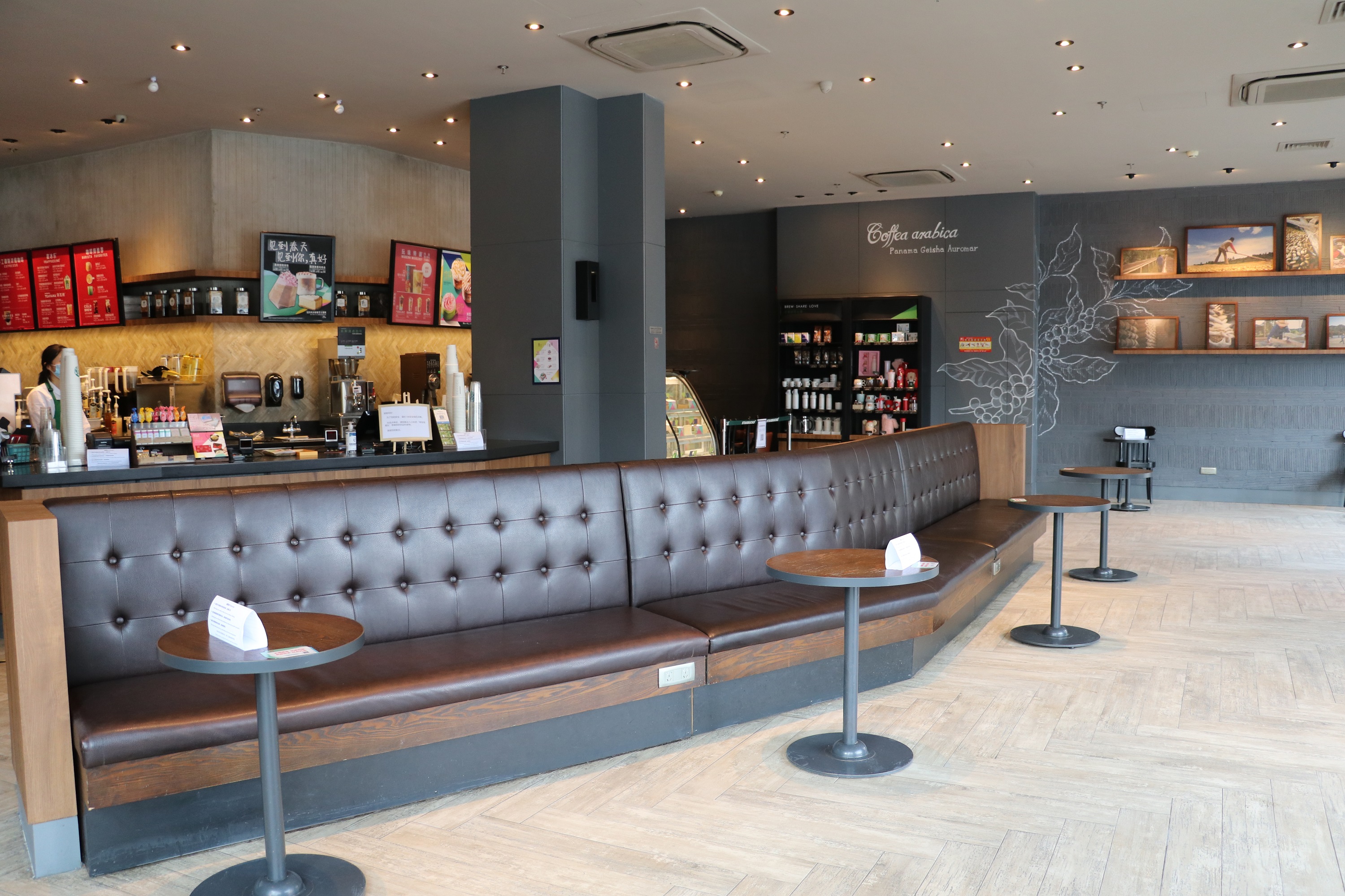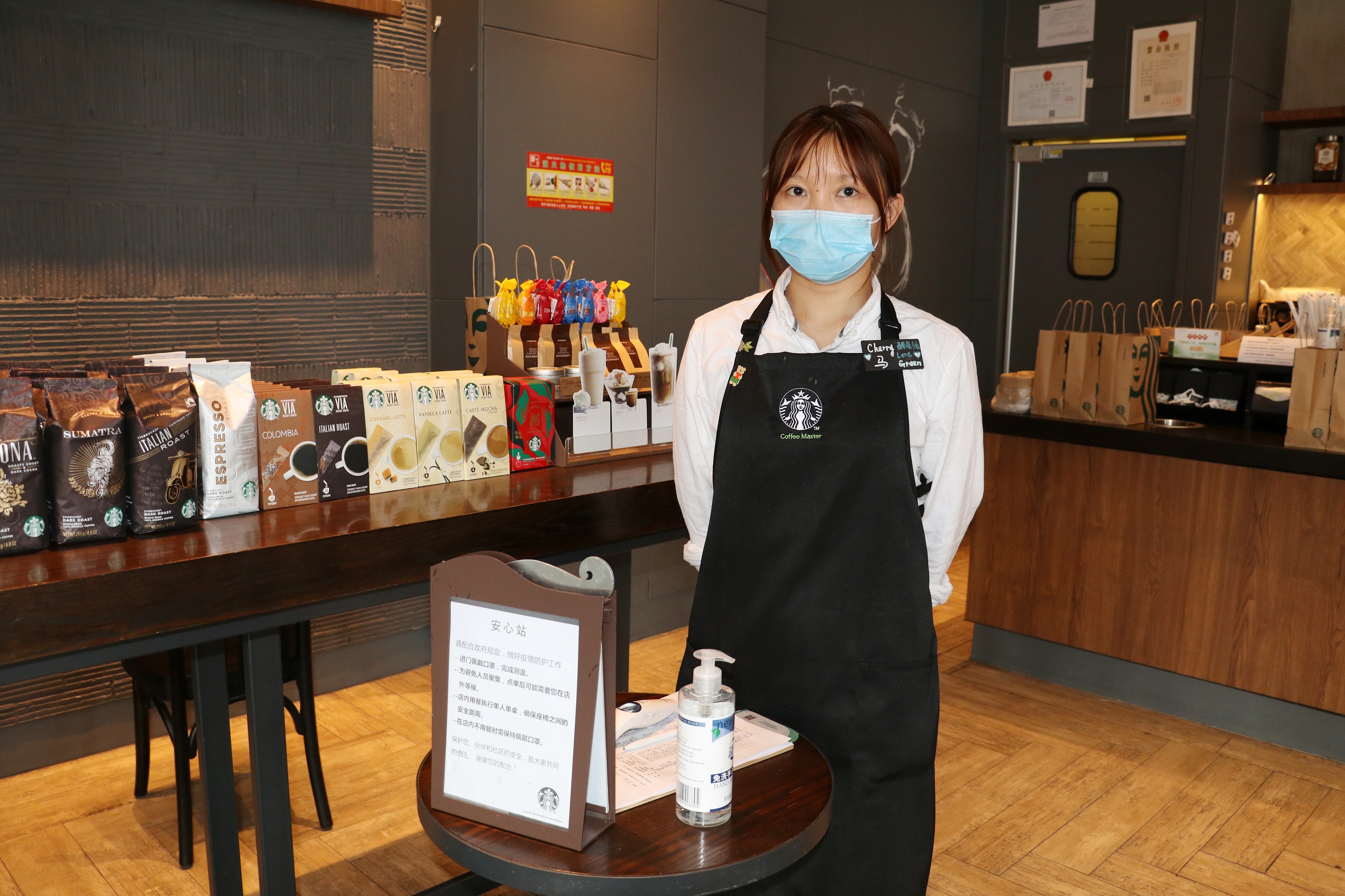 走进星巴克店内,首先看到的便是“防疫安心站”,上面放置有免洗洗手液、测温仪、登记表,顾客只有通过测温、登记信息后方可进入点单,一次一人进入。