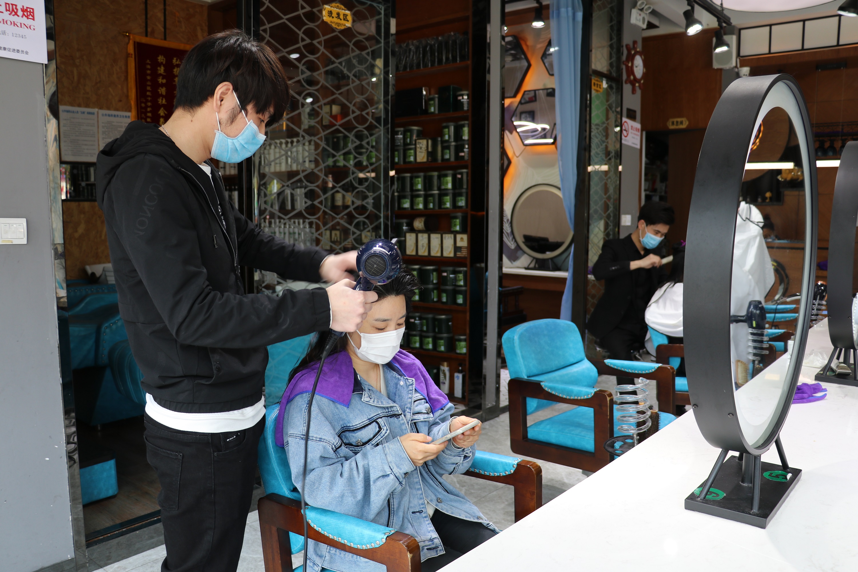 在店内可以看到,顾客之间都间隔了一个座位,理发师和顾客没有过多闲聊。贾店长表示,店里做实做细疫情防控工作,“店员早晚测温2次;店内大厅、座椅、洗头床每天消毒2次;剪刀、梳子等理发工具做到‘一客一用一消毒’,毛巾、围布等公共用品做到‘一客一换一消毒’;此外,每一位进店的顾客都需要登记姓名、电话、住址、到店及离店时间等信息。”