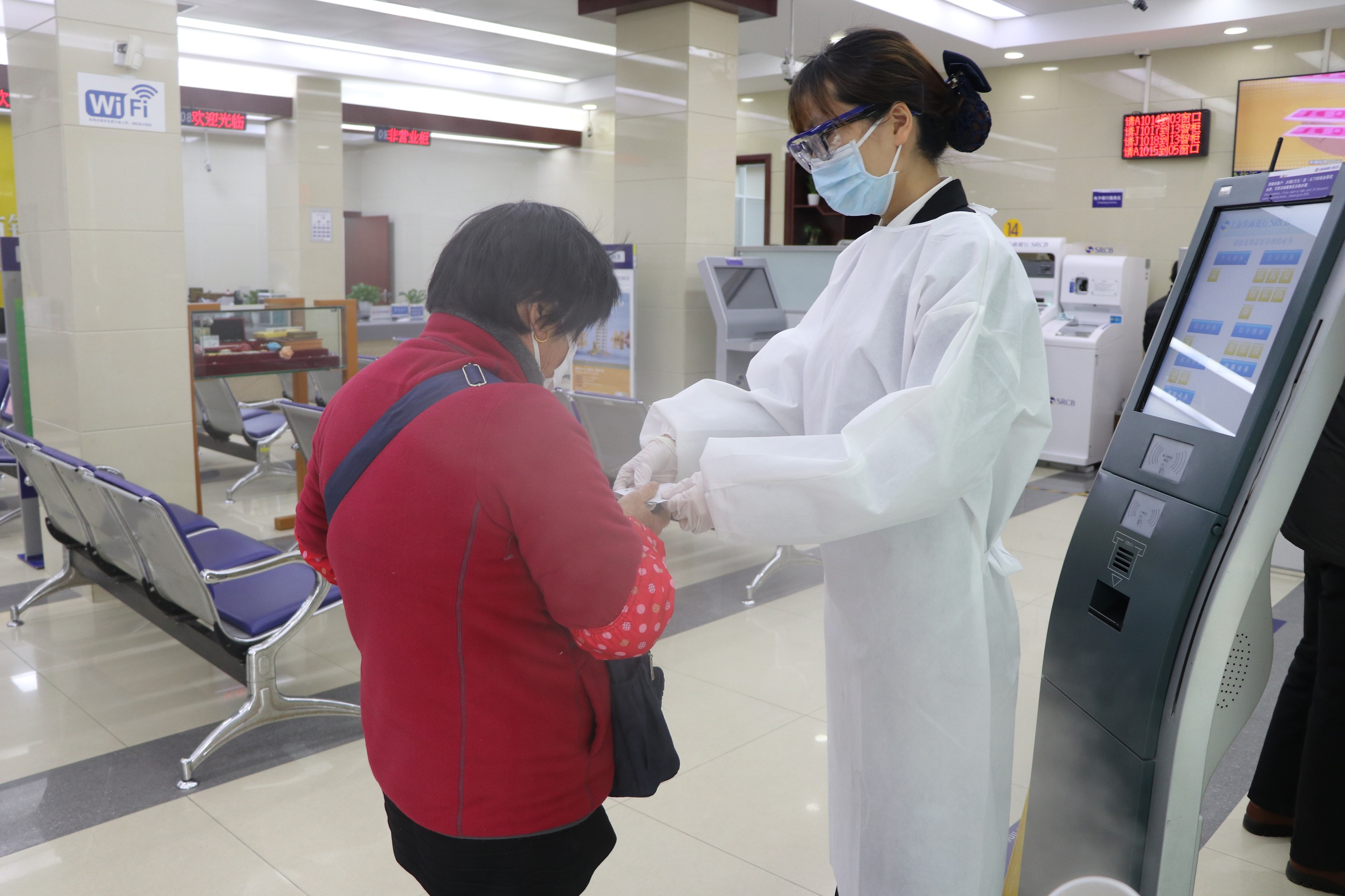 3月12日,在上海农商银行万安街支行的取号机前,穿戴防护服、口罩、手套、护目镜的工作人员小罗,正根据客户需要办理的业务,引导他们分流前往人工柜台或智能柜员机。